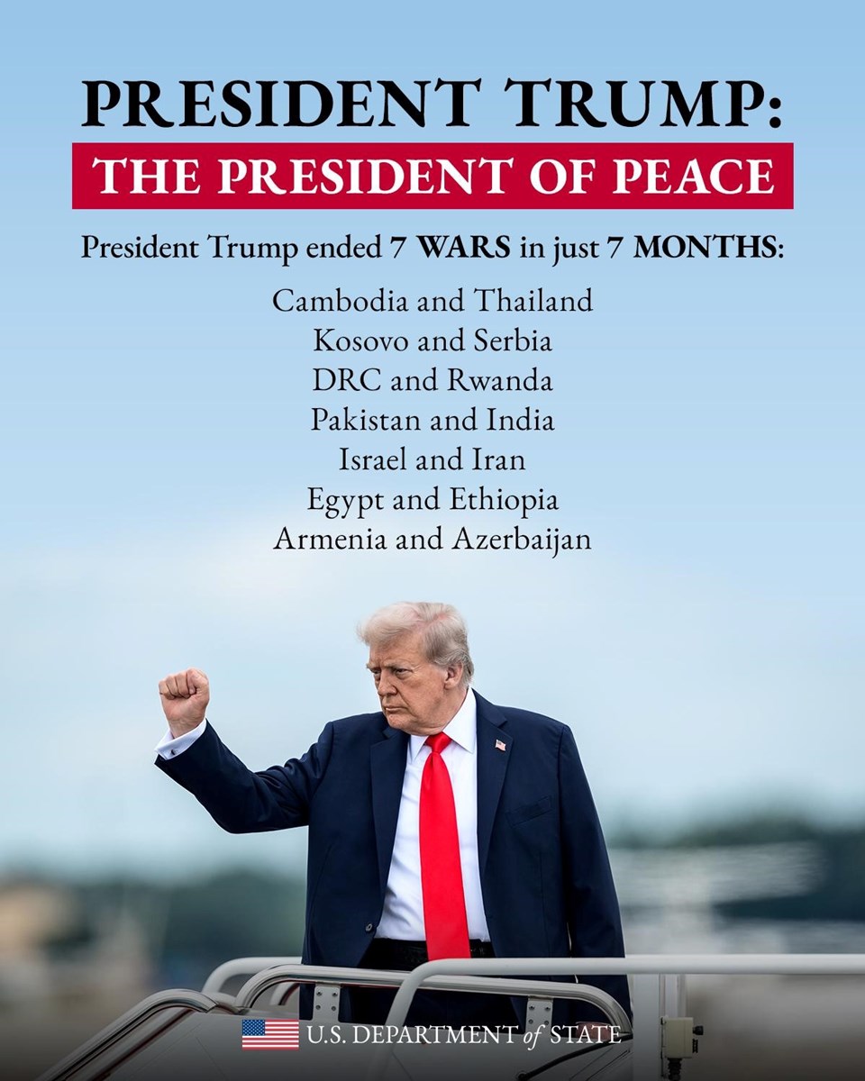 Trump’ın iddia ettiği savaşları sona erdirdiği bir görsel, ‘Barışın Başkanı’ başlığıyla yayınlandı.
