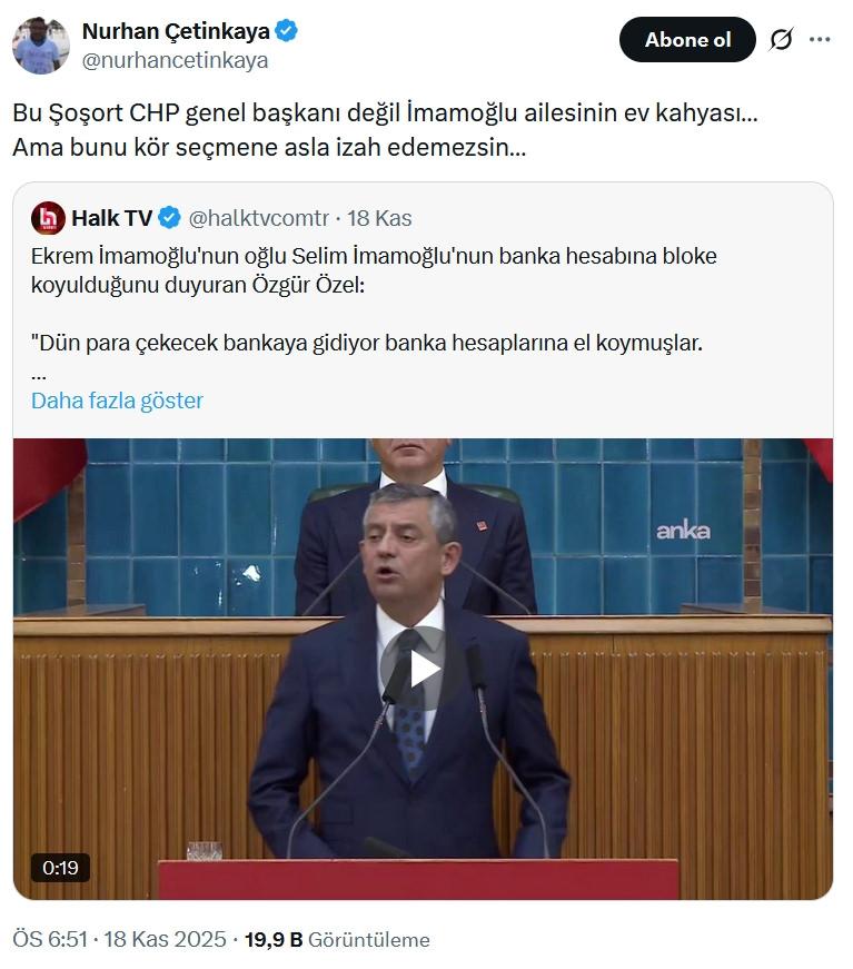 Resmi sosyal medya hesabı üzerinden Özgür Özel’in, Ekrem İmamoğlu’nun oğlu Selim İmamoğlu’nun banka hesabına blokaj uygulanmasına tepki gösterdiği konuşmasını paylaşan CHP’li Nurhan Çetinkaya, şunları söyledi:
